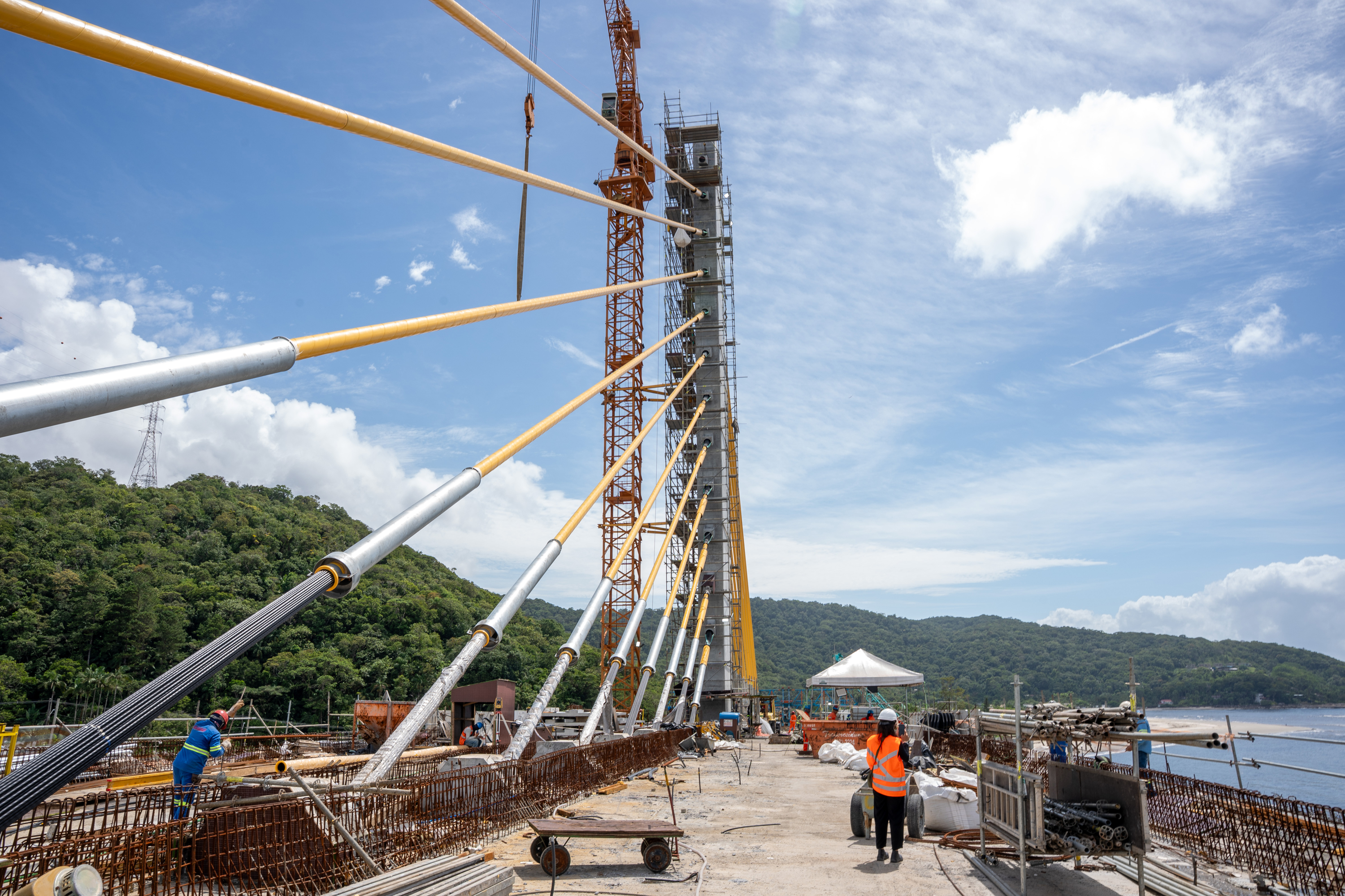 El tramo atirantado, considerado técnicamente el más complejo del proyecto, constituye también el principal elemento arquitectónico de la estructura sobre la Bahía de Guaratuba. En total, se instalaron 12 pares de tirantes en cada uno de los dos pilonos ubicados en los apoyos 04 y 05, garantizando la estabilidad estructural y las condiciones necesarias para la operación segura del puente.