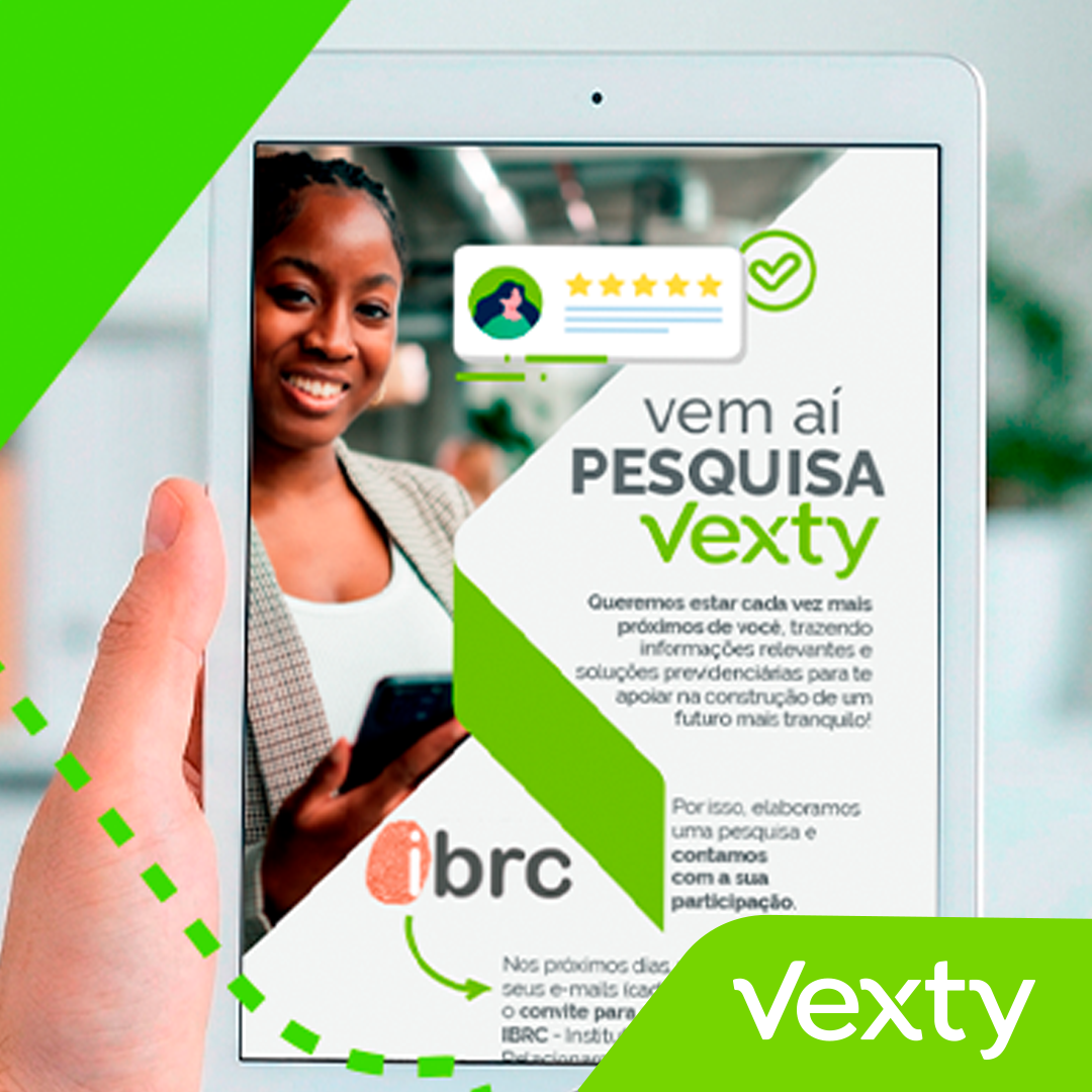 Nos próximos dias, você receberá em seus e-mails (cadastrados da Vexty) o convite para a Pesquisa de Satisfação, que será enviado pelo IBRC – Instituto Ibero-Brasileiro de Relacionamento com o Cliente.